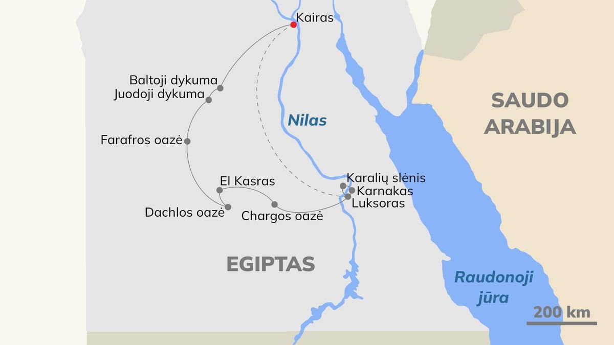 Pusryčiai, išvykimas. Apsilankymas FARAFRO OAZĖJE - miestelyje, kuri yra viena iš labiausiai izoliuotų vietų Egipte. Čia gyvena daugiau nei 4 000 gyventojų, o artimiausia gyvenvietė yra už maždaug 200 km. Farafroje - siauros gatvelės ir freskomis išpuošti namai, gražiai siuvinėtos vietinių gyventojų suknelės ir marškiniai. Oazė garsėja geros kokybės alyvuogėmis ir aliejumi, bananais ir mangais. Kelionė į DACHLOS OAZĘ. Pakeliui aplankykite El Mozavaka kapavietes, garsėjančias spalvingomis freskomis. Paskui aplankykite romėnų šventyklos Deir al-Hagar griuvėsius, datuojamus I mūsų eros amžiumi. Vėlesniais laikais čia buvo įsikūręs koptų vienuolynas, iš kurio išliko biblinių scenų atvaizdai. Pietūs. Kelionė į vaizdingą EL-KASRO miestelį - nuostabios architektūros miestą, pastatytą ant romėnų gyvenvietės griuvėsių. Pasivaikščioję vingiuotomis gatvelėmis pasijusite tarsi „1001 nakties pasakos“ personažas. Šimtai purvo plytų namų, kurie tarpusavyje sujungti perėjimų ir kiemų raizgalyne, sudarančiame tikrą labirintą, suteikia miesteliui nepakartojamo žavesio. Beveik nepaliestas laiko, miestas lankytojus nukelia į viduramžius. Čia pamatysite gražius viduramžių namus, langines, papuoštas originalia mashrabija, portalus su kufiko užrašais ir daugybę senųjų amatininkų suvenyrų. Apgyvendinimas viešbutyje, vakarienė ir nakvynė.