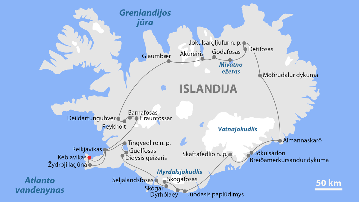 Islandija - gamtos mylėtojų svajonių sala: krištolo tyrumo oras, 10 tūkst. dundančių krioklių, ledynai, upės, ežerai, įlankos, fjordai, ugnikalniai ir dangiški geizeriai. Tai taip pat gyvūnų mylėtojų rojus: ant uolų ir salelių būriuojasi spalvingi mormonai, šiauriniai padūkėliai ir žuvėdros. Apaugę samanomis, žole ir kerpėmis, dideli šalies plotai tarnauja kaip avių ir ilgaplaukių islandiškų arklių ganyklos, o salą supančiuose vandenyse gyvena daugybė jūros žinduolių rūšių: banginiai, orkos, delfinai ir ruoniai. Vasarą saulė šviečia beveik 24 valandas per parą, todėl galima be galo grožėtis nesuvaržytos gamtos grožiu. Maršrute laukia gražiausi peizažai, Didysis geizeris, nuo kurio kilęs pavadinimas „geizeris“, garsūs ledyniniai ežerai, fantastiniai kriokliai ir nacionaliniai parkai su endemine augmenija ir laukiniais gyvūnais, kokių nėra niekur kitur pasaulyje. Islandija žavi ne tik gamtos stebuklais, bet ir įdomiais gyventojų papročiais bei draugiškumu. Vikingų žemė, įamžinta tūkstančiuose sagų, leis pajusti visus gamtos elementus: žemę, orą, vandenį ir ugnį.