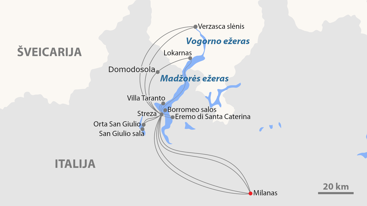 Italijos ežerų krašto grožis, nuostabus klimatas, įspūdingose vietose įsikūrusių šventovių mistika yra tik dalis šio nepamirštamų vaizdų kupino maršruto perlų. Maršrutas tęsiasi per du regionus: Lombardiją ir Pjemontą, paliesdamas Šveicarijos pasienio regionus. Programoje yra du garsūs ežerai: Madžorė ir Orta, kruizai į vaizdingas salas, pakilimas į Mottarone su įspūdinga panorama ir pasivažinėjimas nuostabia trasa Centovalli geležinkeliu. Džeimso Bondo mėgėjams tikrai bus įdomu apsilankyti šuolio, matyto pirmuosiuose „Auksinės akies“ kadruose, vietoje. Kosmopolitiškasis Milanas – tai tikra šventė meno mylėtojams ir žmonėms, besidomintiems naujausiomis mados tendencijomis.