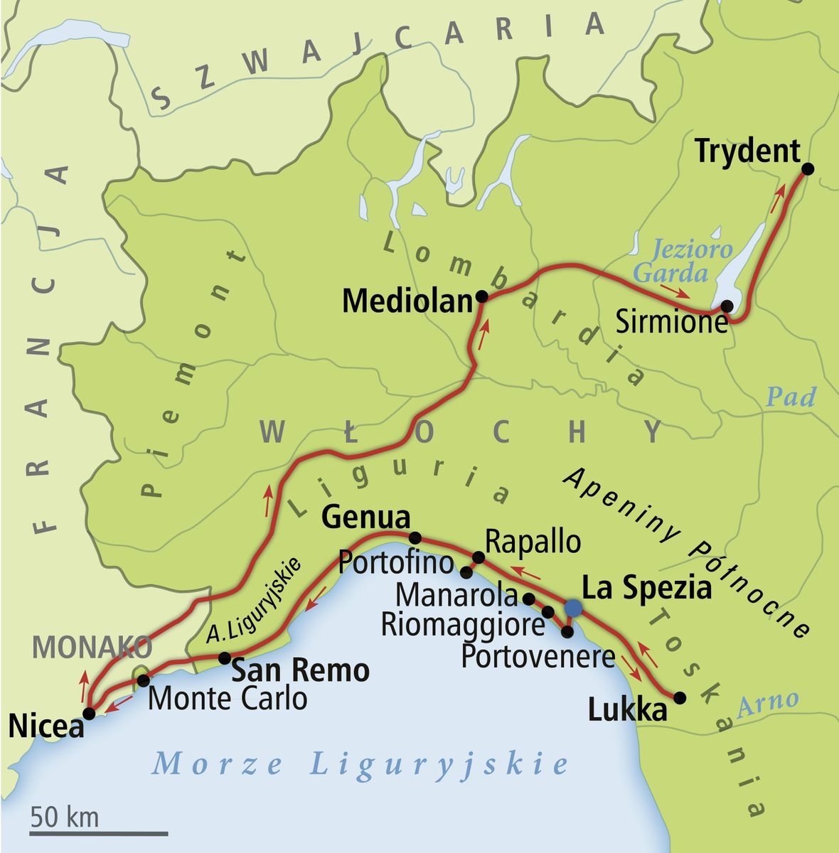 Gražiausi Ligūrijos ir Šiaurės Italijos miestų vaizdai įtraukiant į įvairiapusę ir labai įdomią programą. Ligūrija – garsioji saulės ir jaukių vietų kraštas, kur laikas tarsi sustojo, kviečia trumpoms atostogoms prie Ligūrijos jūros ir kelionei po Penkis pasaulius – Cinque Terre. Maršrute laukia tokios įdomios vietos kaip Genuja – Kolumbo gimtinė, ir kosmopolitiškas Milanas. Vertėtų pasirinkti papildomą ekskursiją ir per vieną dieną aplankyti garsiuosius miestus – Monaką, Monte Karlą ir Nicos miestą. Kelionės atstumas Italijoje: apie 2000 km.
