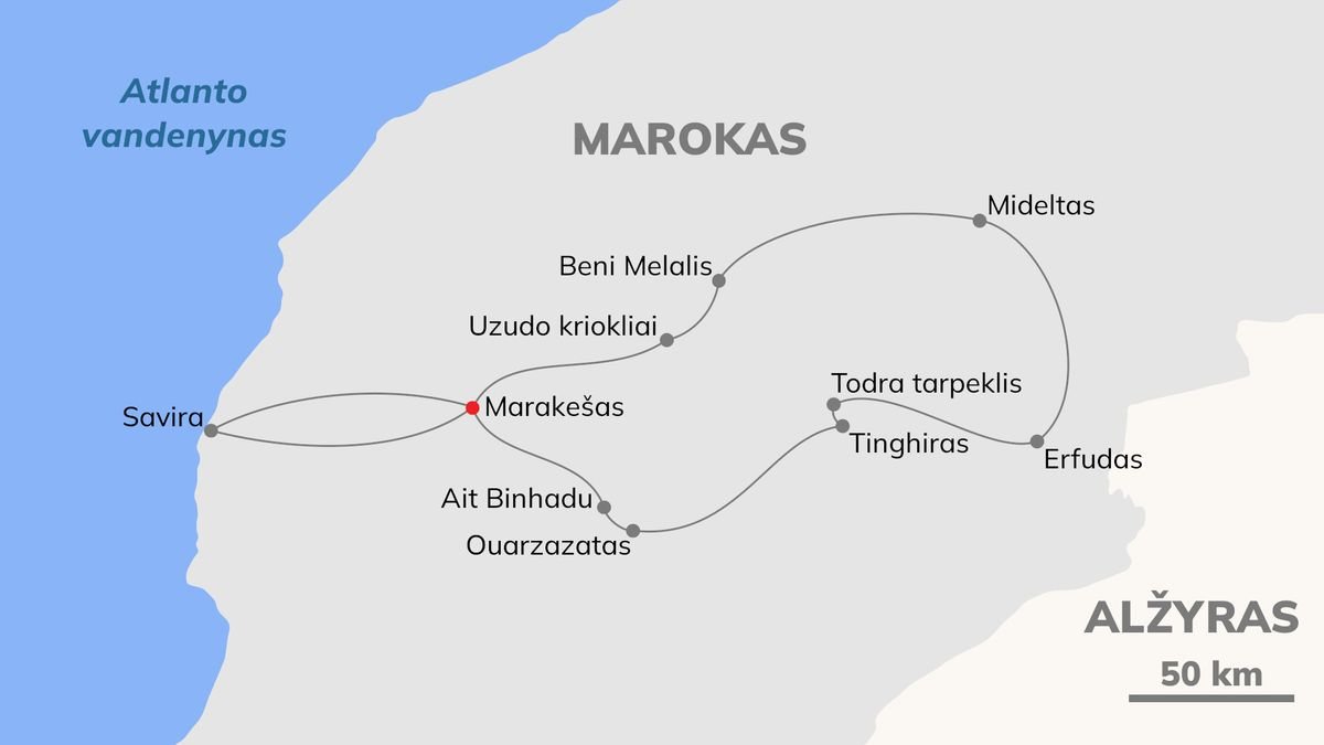 Marakešas • Ait Binhadu • Ouarzazatas • Tinghiras • Todra tarpeklis • Erfudas • Mideltas • Beni Melalis • Uzudo kriokliai • Savira • Marakešas