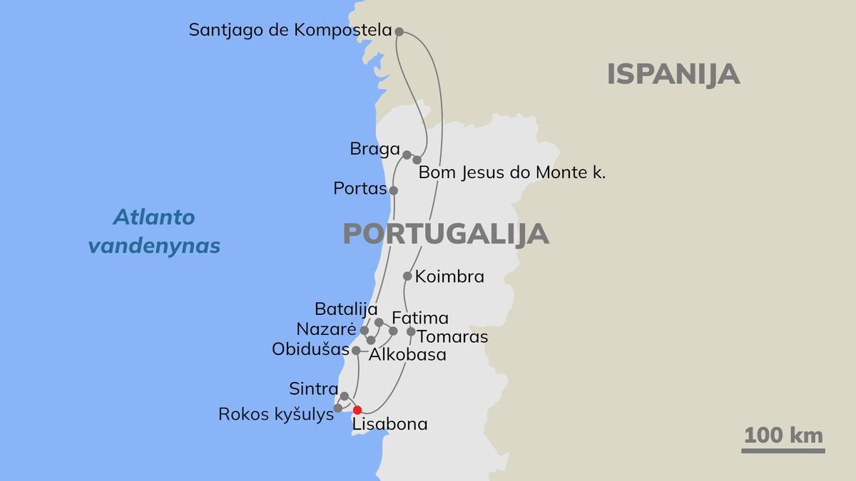 Kelionė po įdomiausias ir gražiausias Portugalijos vietas, turtingas UNESCO paminklais ir įspūdingais kraštovaizdžiais. Kelionės metu aplankoma: Sintra su nuostabiomis rezidencijomis ir paslaptingomis pilimis; Koimbra – kur senovė susitinka su dabartimi, Porto miestas su unikalia atmosfera, kuriame bus laiko paragauti garsiojo gėrimo ir, žinoma, žavingoji Lisabona. Į programą taip pat įtraukti svarbiausi religiniai centrai Portugalijoje ir Ispanijoje, tarp kurių – garsiosios Santjago de Kompostela, Fatimos ir Bom Jesus do Monte šventovės.