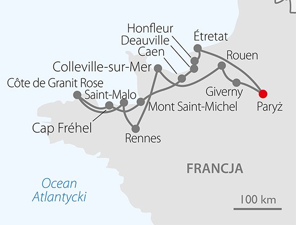Smėlio paplūdimiai ir stačios uolos, įsiterpiančios į jūrą – taip atrodo nepaprastas Normandijos ir Bretanės pakrantės kraštovaizdis, regionų Prancūzijoje, kuriuose dar tiek daug ką atrasti. Žavi neįprasta Mont Saint-Michel grožiu, viena didžiausių Prancūzijos lankytinų vietų. Maršrute – vietos, įamžintos dailininkų ir rašytojų kūriniuose, susitikimai su menu ir nuostabūs peizažai. Programoje taip pat „klasikinis“ Paryžiaus apžvalginis turas, apimantis visas svarbiausias turistines vietas.